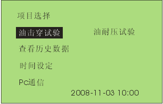 7 通過旋轉(zhuǎn)鼠標(biāo)可以選擇進(jìn)行擊穿試驗,耐壓試驗,查看歷史數(shù)據(jù),時間設(shè)定和PC通信等操作項目。
